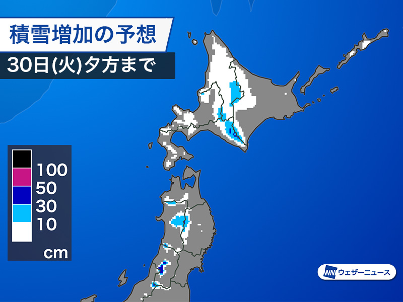 北海道は全般的に雪や雨の降るところが多く、日本海側では積雪急増や吹雪のおそれがあります。路面が滑りやすくなるため、足元の変化には十分ご注意ください。