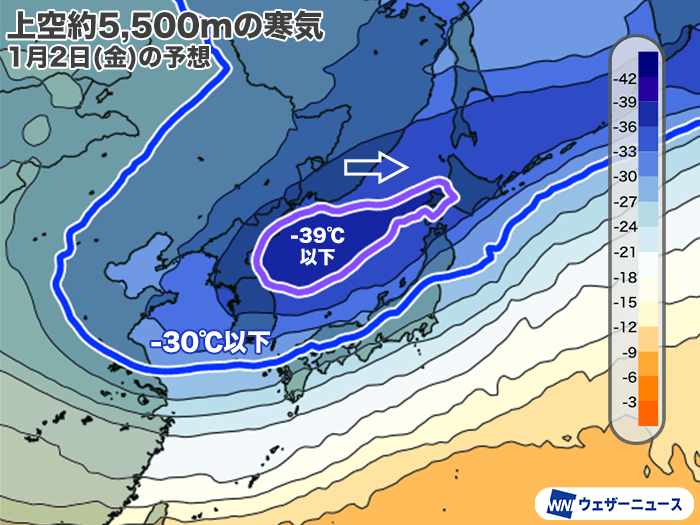 年末から日本に接近する寒気は、年明けの1月2日(土)から3日(日)頃がピークになるとみられます。
