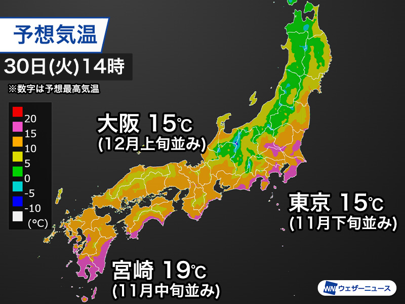 最高気温は15℃前後まで上がり、日中は暖かく感じられそうです。