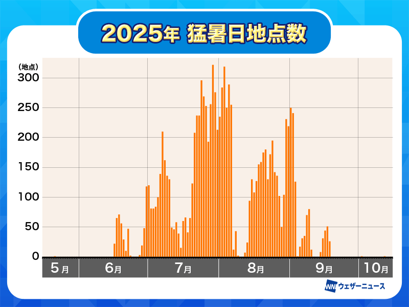 猛暑日地点数の合計は10410地点と去年を上回り、現在の統計方式となった2010年以降で最多です。