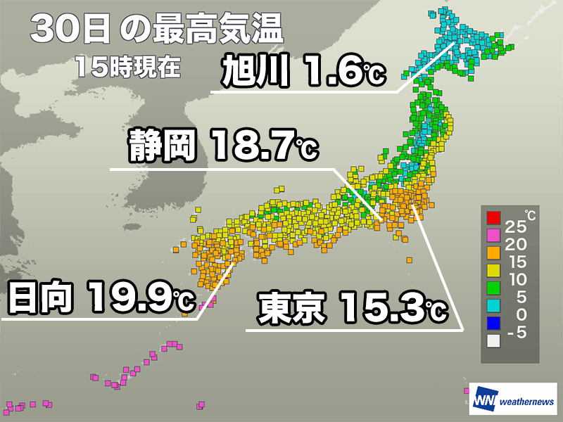 各地の最高気温は東京都心で15.3℃、静岡市で18.7℃、宮崎県日向市で19.9℃まで上がりました。東京都心で年末のこの時期(12月26〜31日)に15℃を上回るのは、2019年12月31日以来、6年ぶりです。