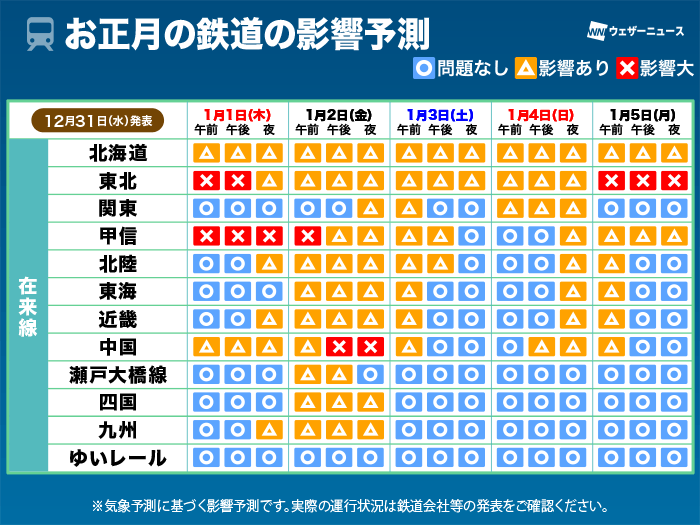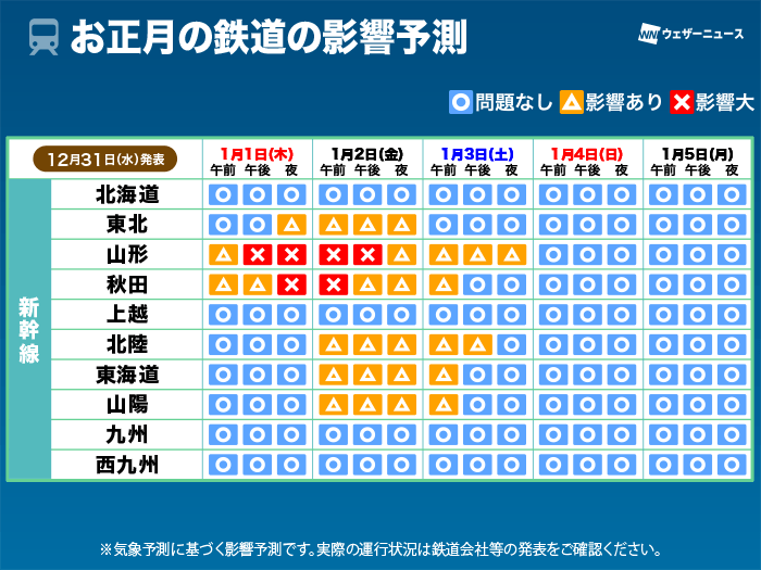 1月1日(木)頃から3日(土)頃にかけて寒気の影響を受け、東北・山形・秋田・北陸・東海道・山陽新幹線で遅延や運転見合わせが発生するとみられます。