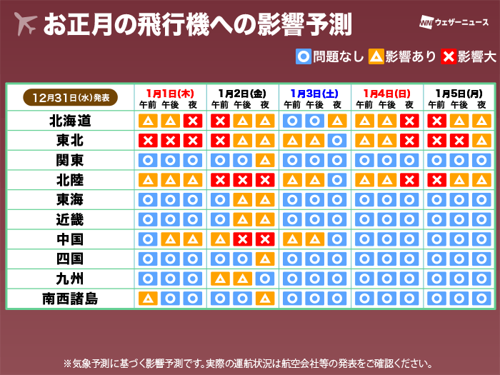 正月休み明けの1月5日(月)頃にかけても、日本列島は冬型の気圧配置となり、雪や風が強まる見通しです。北海道や東北に加え、北陸、関東、東海、近畿、中国、九州の各空港でも、遅延や条件付き運航の可能性があります。