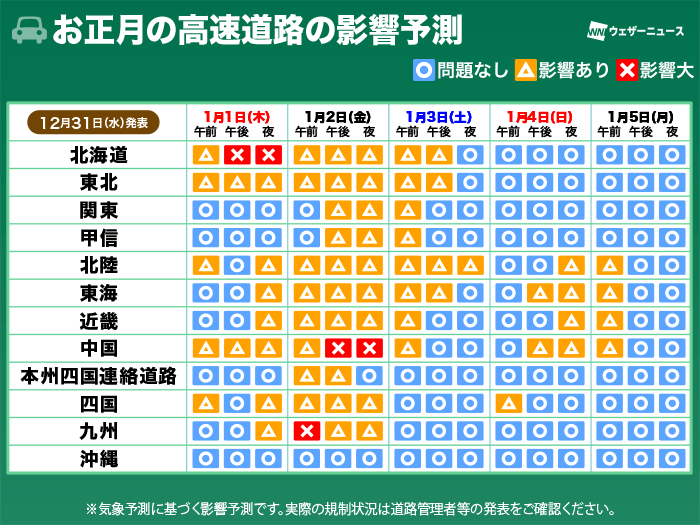 特に1月1日(木)頃から3日(土)頃にかけては、強い寒気の影響により通行止めに至る区間もあるとみられます。