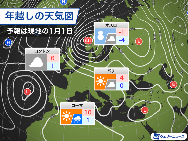 フランスなどは晴天の年明けですが、気温は低めの予想で、パリの最高気温は4℃までしか上がりません。