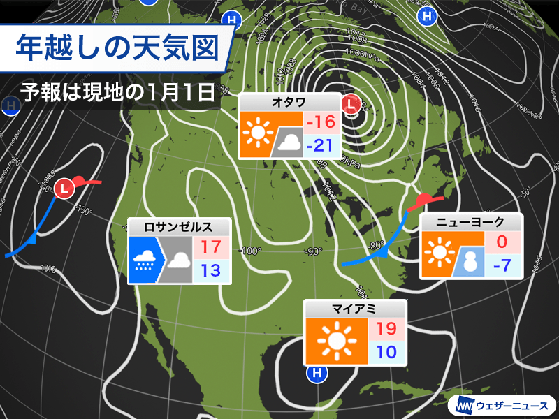 アメリカ北部やカナダは冷え込みが厳しく、オタワの最低気温は−20℃未満の予想となっています。