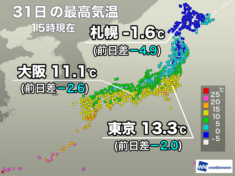 15時までの最高気温は札幌市が−1.6℃で4日ぶりの真冬日になっています。東京都心は昨日に比べて2.0℃低い13.3℃、大阪市は2.6℃低い11.1℃に留まりました。