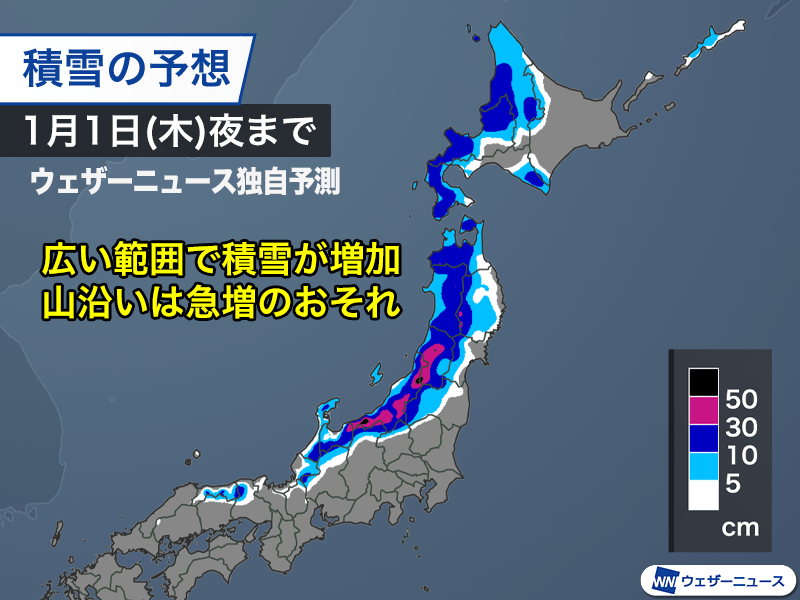 冬型の気圧配置が強まるため、北日本の日本海側や北陸は断続的に雪が降ります。雪が強まるタイミングがあり、内陸部や山沿いを中心に大雪となる見込みです。