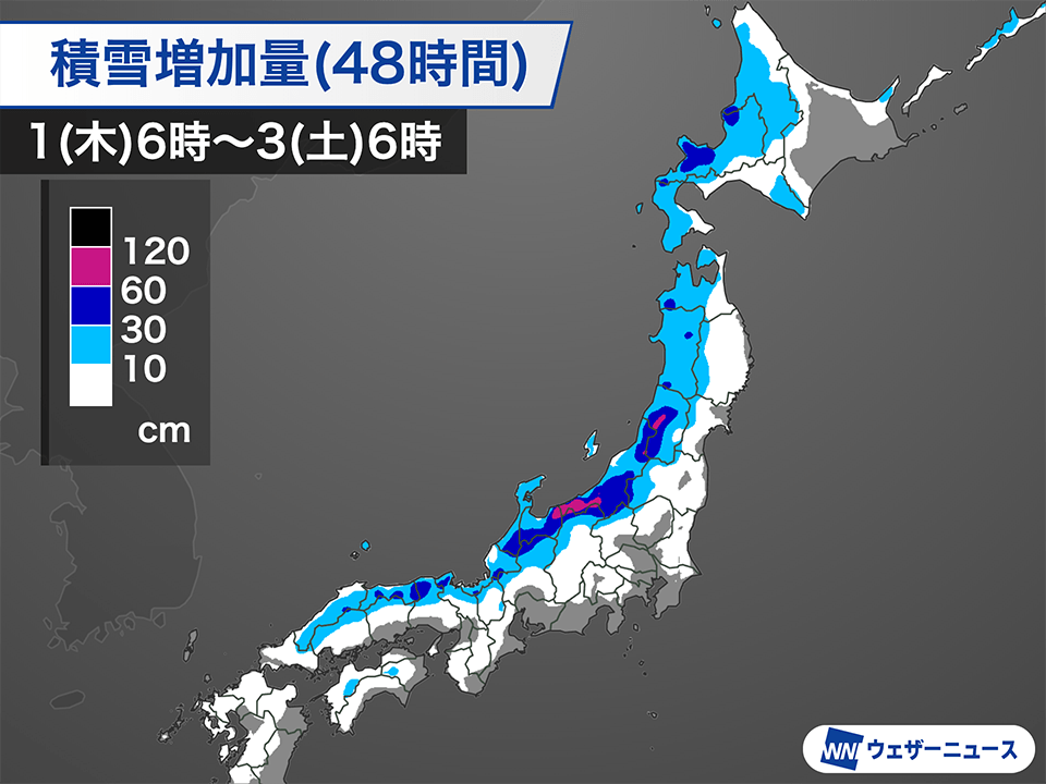 この先一週間は冬型の気圧配置が強弱を繰り返します。特に明日1月2日(金)は寒気の南下がピークとなり、日本海側の広範囲で雪が降って、西日本でも積雪となるおそれがあります。