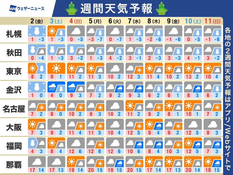 特に三が日は各地で気温が平年よりも低く、寒さが厳しく感じそうです。その後も概ね平年並みの日が多く、この時期らしい寒さが続きます。初詣にお出かけの場合は手袋やマフラーなどを活用し、体を冷やさないよう心がけてください。