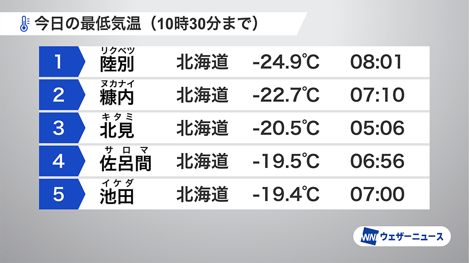 今日1月1日(木)・元日は全国的に寒さが厳しくなっています。朝の最低気温は北海道の広い範囲で−10℃を割り込み、北見では-20.5℃を観測しています。