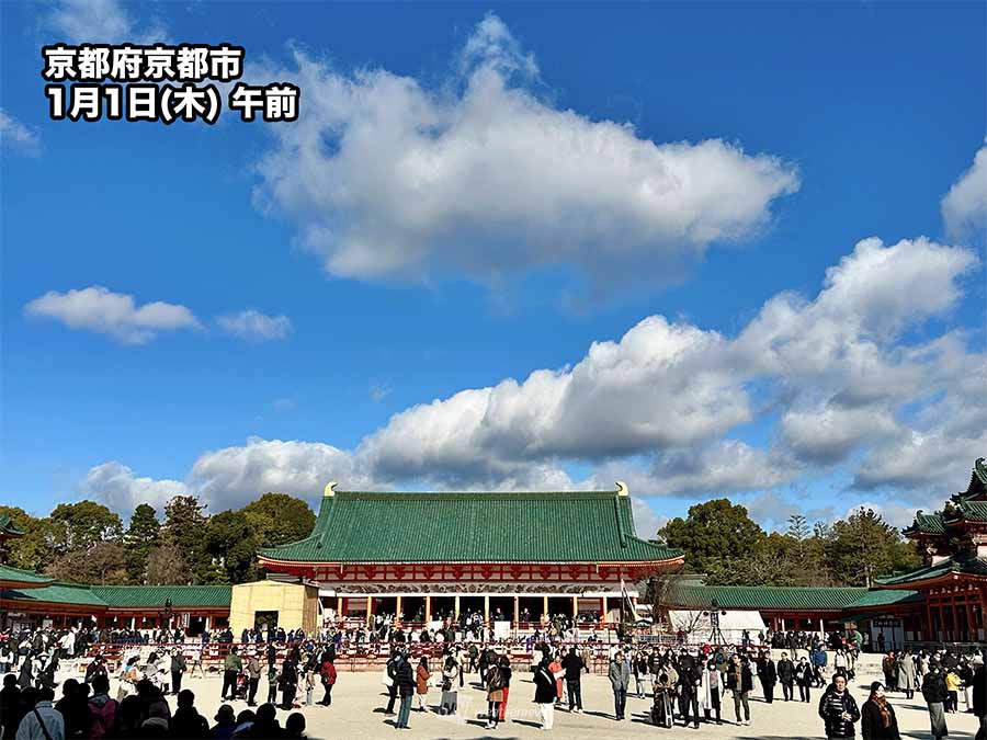 太平洋側の各地は雲が多めながら日差しの届いている所が多くなっています。明日は太平洋側でも雪や雨の降る可能性があるので、初詣は今日の方が安心なところが多そうです。