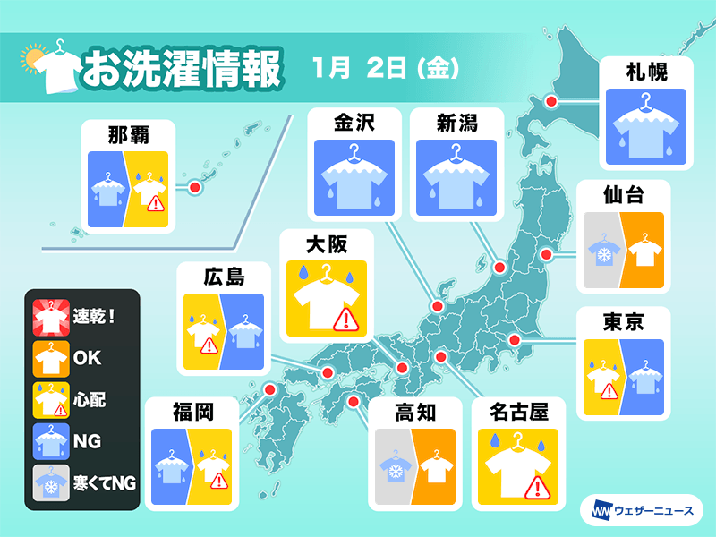 冬型の気圧配置が強まり、日本列島の上空を強い寒気が通過していきます。日本海側の各地は北海道〜北陸だけでなく、西日本でも雪になりますので洗濯物の外干しはNGです。