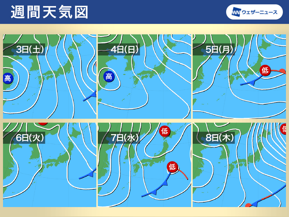 来週もしばらく冬型の気圧配置は続きますが、6日(火)〜7日(水)頃は少し緩む傾向です。ただ、気圧の谷や低気圧の影響で、日本海側や太平洋側で雲の広がる可能性があります。太平洋を東進する低気圧の影響次第で予報が変わる可能性も考えられます。