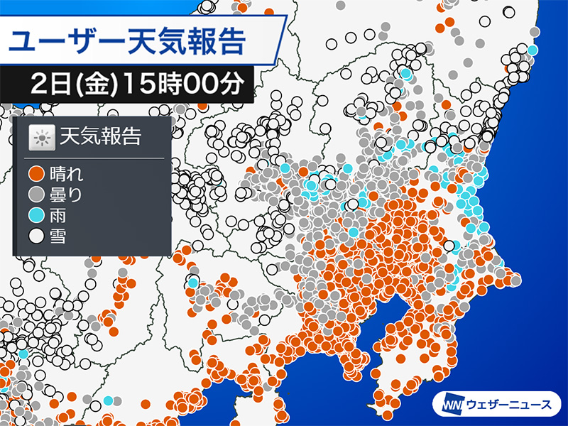 午後になって山沿いや内陸部で雪雲や雨雲が発生してきました。15時の時点では群馬県から栃木県で雪、茨城県で雨や雪の降っている所があり、東京都心周辺は日差しが届いています。
