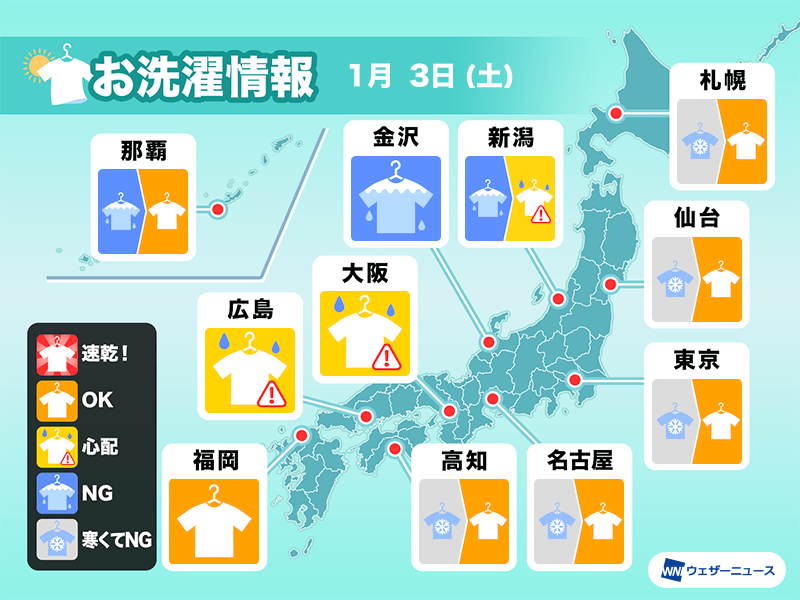 昨日は東日本や西日本の太平洋側でも雪の降るような一日でしたが、今日は上空高い所の寒気が東に離れるため太平洋側は天気が回復します。朝は気温が低くて乾きが鈍いので、少し気温が上がってから外干しするのが良さそうです。