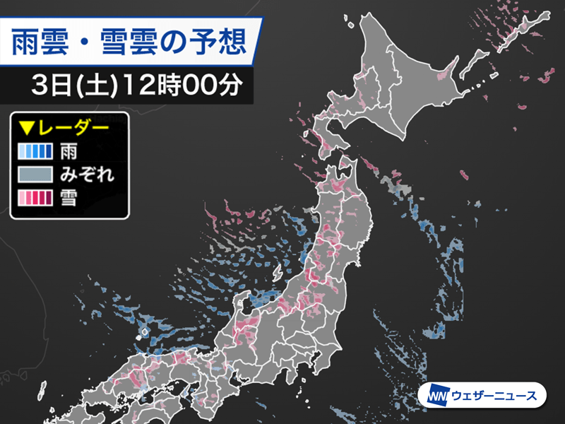 太平洋側は日差しの届く所が多くなります。雪や雨の降るエリアは昨日よりかなり縮小する見込みです。