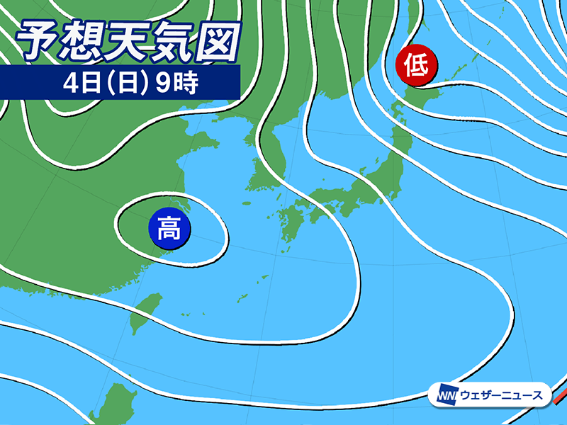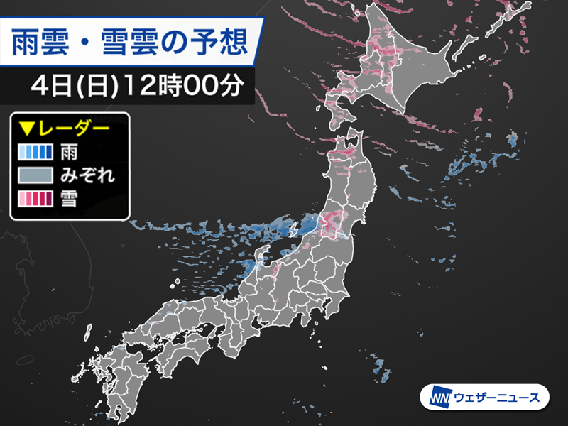 今日4日(日)は冬型の気圧配置が続きます。北日本日本海側や北陸内陸部では断続的に雪が降り、一時的に強まるおそれがあります。積雪の増加に注意してください。