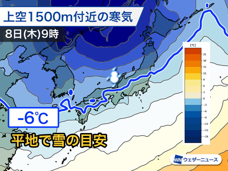 8日(木)は低気圧が東の海上へ抜けて、再び強い冬型の気圧配置となります。上空に強い寒気が流れ込むため、日本海側では雪や雨が降り、北陸以北では内陸の山沿いを中心に大雪となるおそれがあります。