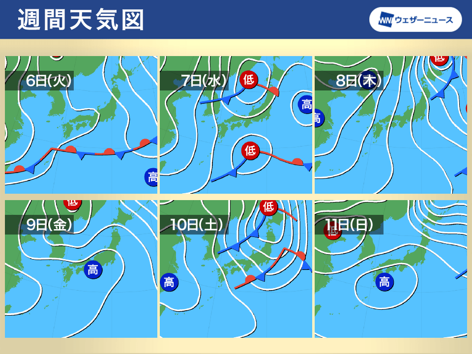 6日(火)は冬型の気圧配置が西から緩み、日本海側の雪や雨のエリアは徐々に縮小します。7日(水)になると日本海の低気圧が発達しながら北海道に接近し、前線が本州を通過するため、北日本から北陸にかけて広く雨や雪となります。