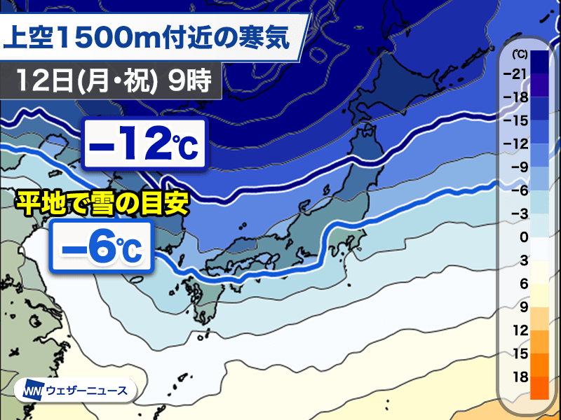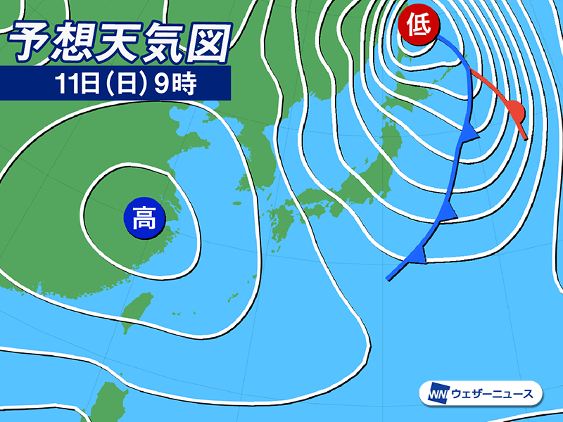 その後、11日(日)から12日(月・祝)は強い冬型の気圧配置になる予想です。上空の強い寒気が日本列島を覆い、全国的に寒くなる見込みです。