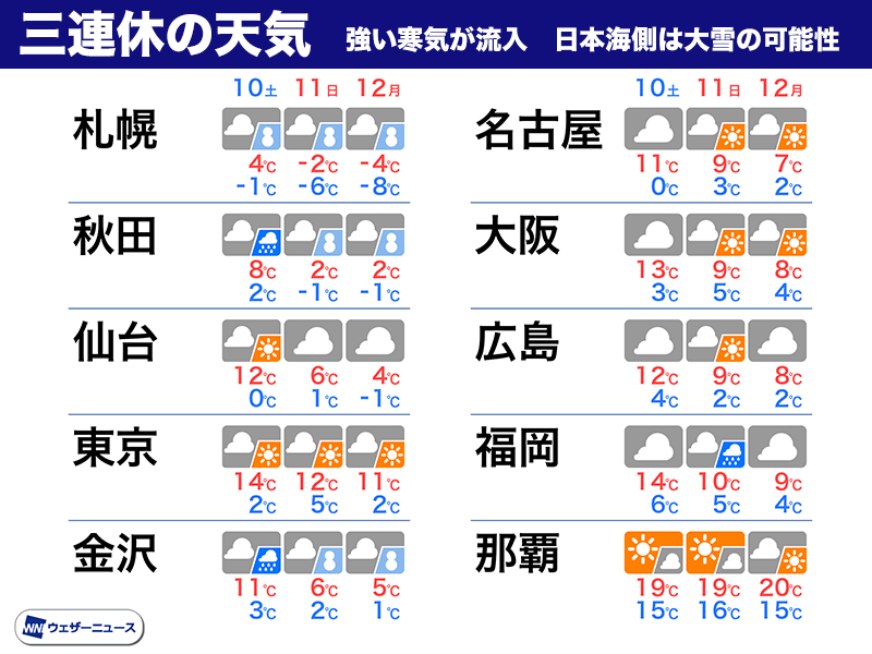 次の三連休は荒天のおそれ 日本海側は大雪の可能性も