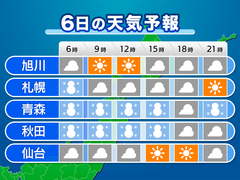 東北の太平洋側は変わりやすい空で、日差しが届いてもにわか雪に注意が必要です。北海道の太平洋側は晴天です。