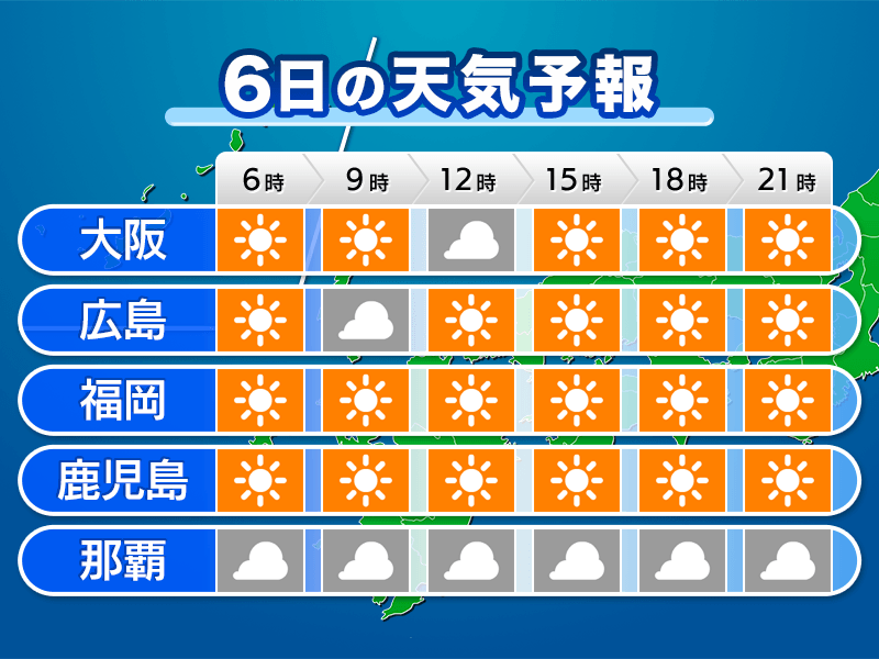 沖縄や奄美は雲の広がるスッキリしない空です。雨の降る心配もあるため、空の変化にお気をつけください。