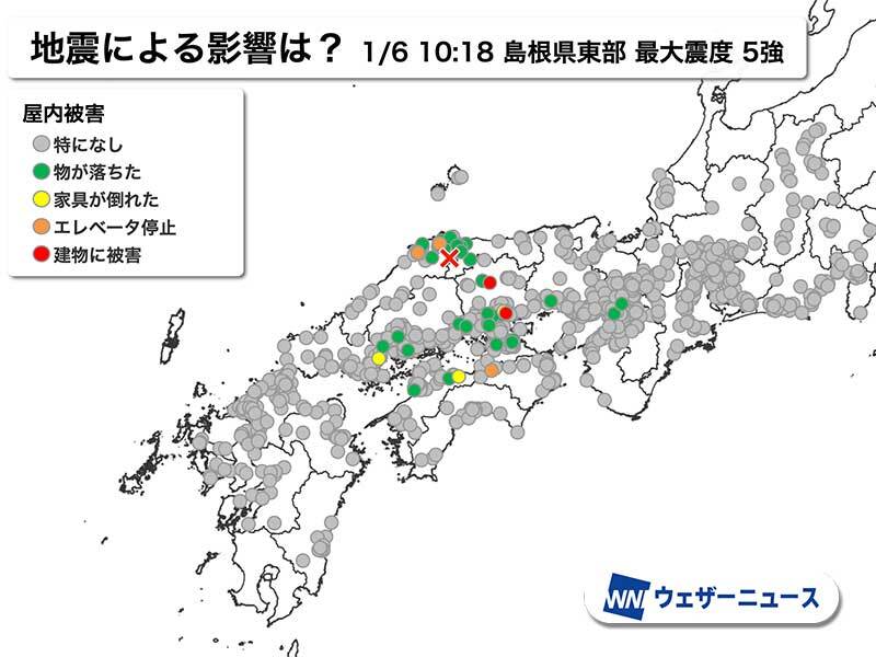 ウェザーニュースアプリ利用者からの影響報告では、震源に近く震度5弱〜5強の揺れに見舞われた島根県と鳥取県の県境付近で「物が落ちた」、「エレベーター停止」などが集中しています。