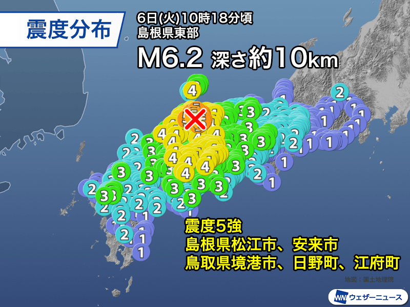今日6日(火)10時18分頃、島根県東部を震源とするマグニチュード6.2、深さ約10kmと推定される地震が発生しました。この地震で島根県松江市、安来市、鳥取県境港市、日野町、江府町で最大震度5強を観測。九州北部から近畿にかけての広範囲で震度3以上の揺れを観測しています。