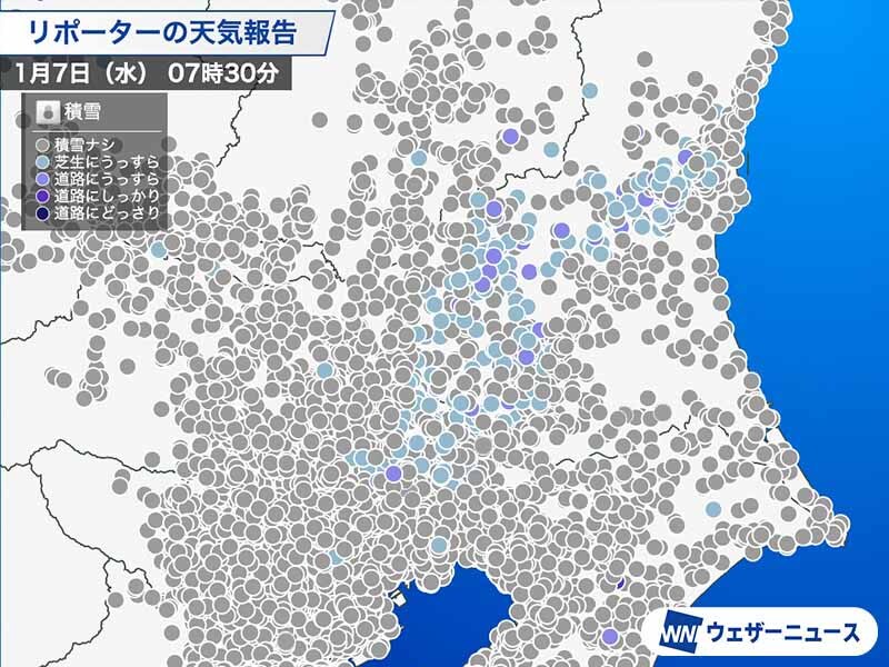 今朝は東京や神奈川、千葉で弱い雪が降りました。茨城県では場所によってうっすらと積もっているところもありそうです。