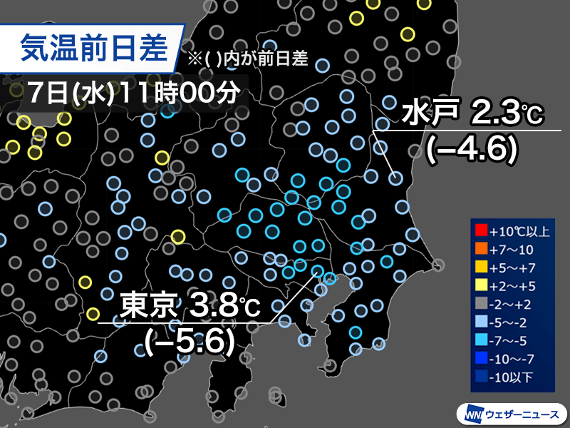 11時00分の気温は昨日の同じ時間帯に比べて5℃前後も低く、東京都心は5.6℃低い3.8℃、雪が降った水戸市は4.6℃低い2.3℃となっています。