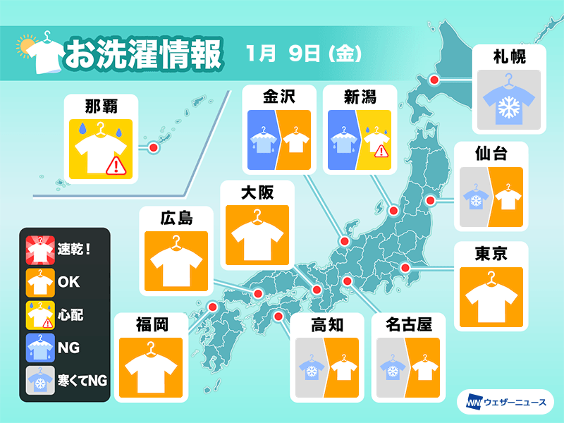 東北日本海側や新潟は雪の降る可能性があるため室内干しがおすすめです。