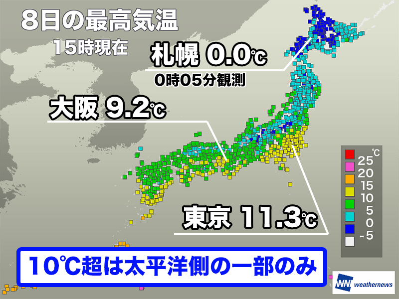 15時時点の最高気温の分布をみると10℃以上となったのは西日本や東日本の太平洋側の一部に限定されました。最高気温は東京で11.3℃、大阪で9.2℃、福岡で8.5℃でした。