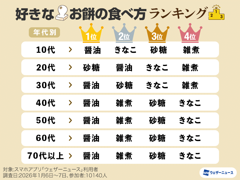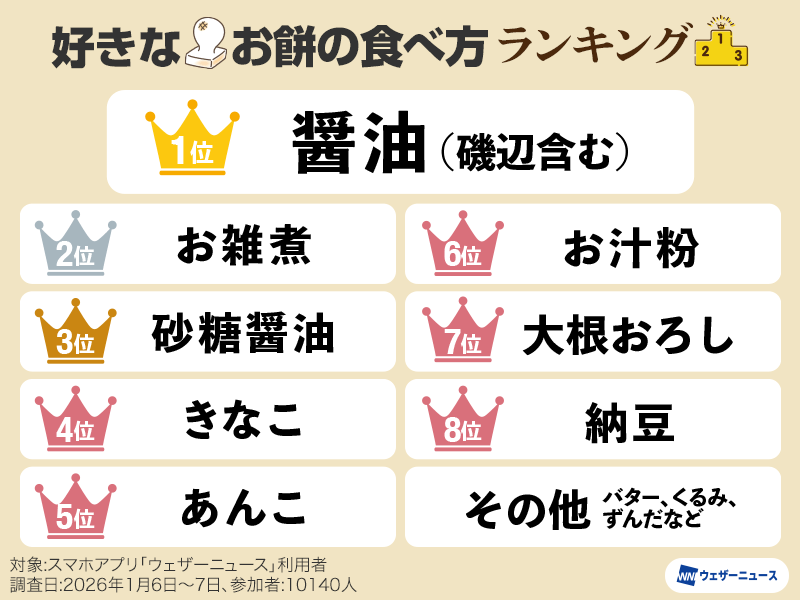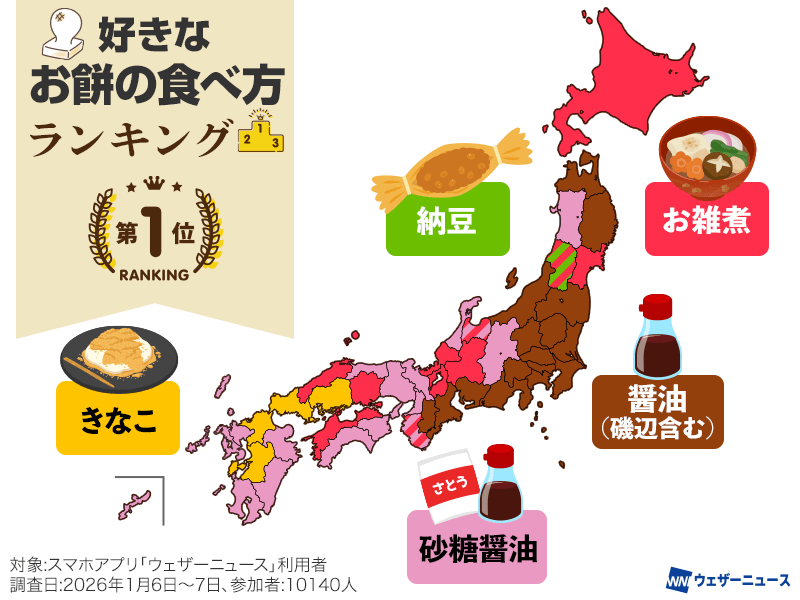 アプリ「ウェザーニュース」ユーザーに「好きなお餅の食べ方は?」と質問し、醤油(磯辺含む)、砂糖醤油、きなこ、あんこ、お雑煮、お汁粉、納豆、大根おろし、その他の9つから選択していただきました。(10140人が参加)