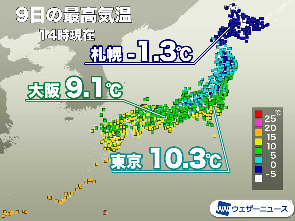 今日9日(金)14時までの最高気温は、札幌-1.3℃、東京10.3℃、名古屋9.0℃、大阪9.1℃、福岡10.5℃でした。