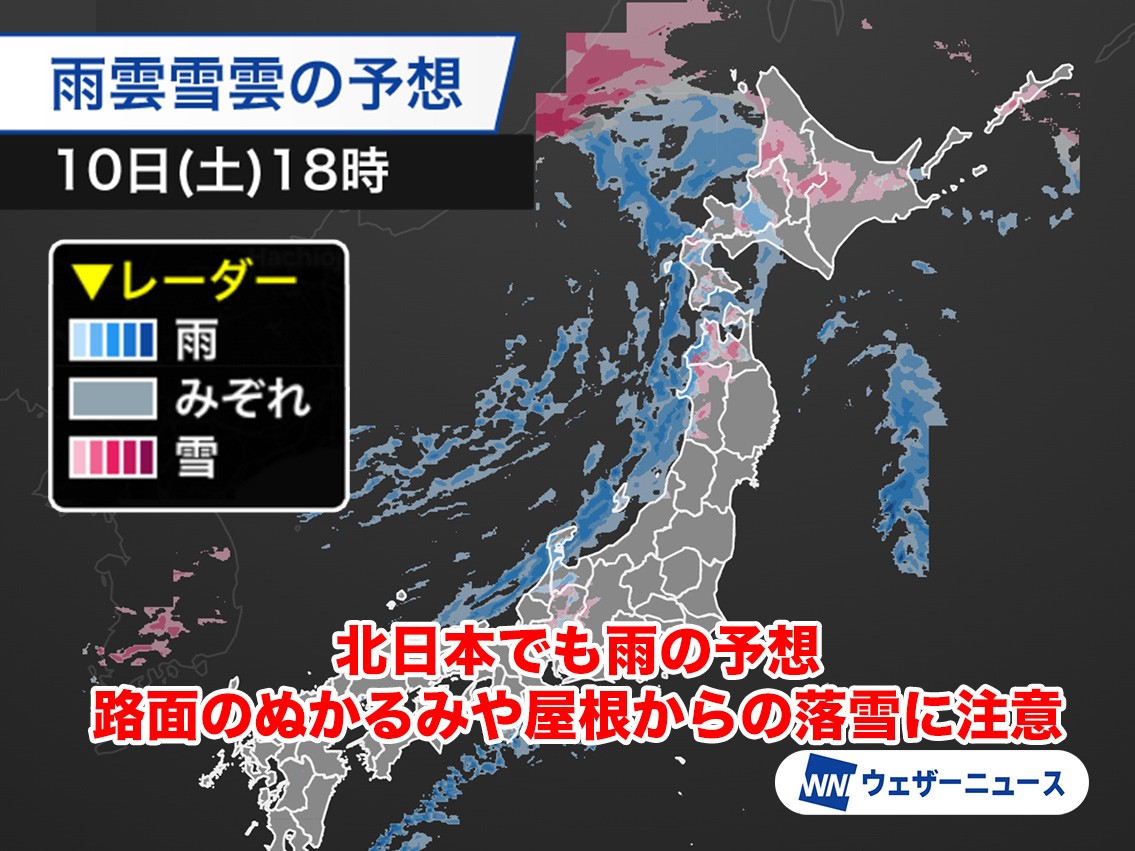 気温が高くなるため、平地では雪ではなく雨やみぞれの所が多くなります。