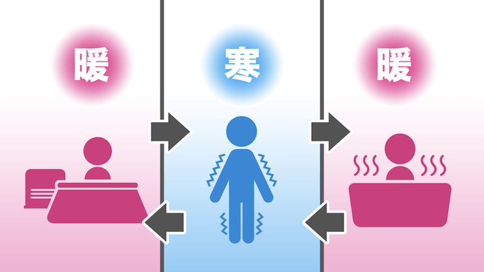 また、油断しがちなのが、ゴミ出しや洗濯物などで外に出る際です。室内と屋外の気温差が大きいので、短時間でも油断せずに外に出る際は、なるべく気温差を緩和できるよう上着を羽織るなどの対策を忘れないようにしてください。