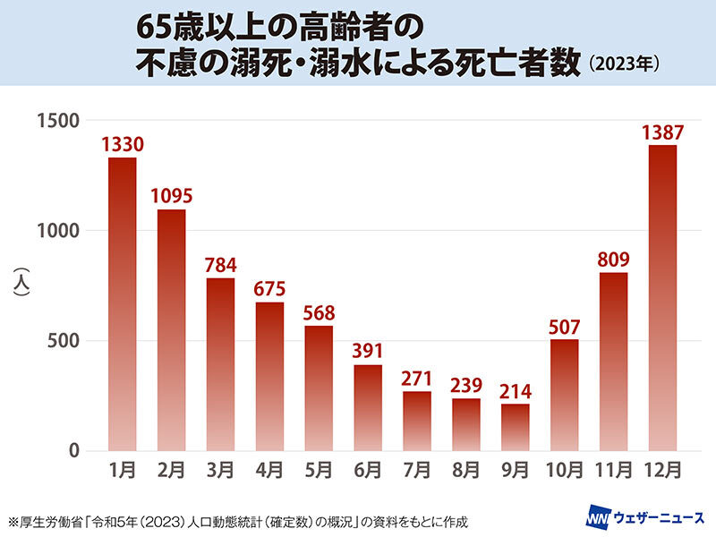 「冬場にヒートショックが原因とみられる溺死・溺水事故が多い原因としては、夏場に比べて暖かい室内と寒い脱衣所や浴室との寒暖差が大きく、急激な血圧の変動が起こりやすいこと。さらに熱い湯に長くつかることによる体温上昇で血管が広がり、血圧効果による意識障害が起こりやすいことが挙げられます。