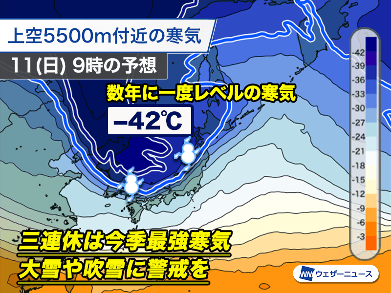 明日11日(日)から冬型の気圧配置が強まり、今季最強レベルの寒気が南下します。日本海側の地域を中心に雪が降り、大雪や吹雪に警戒が必要です。