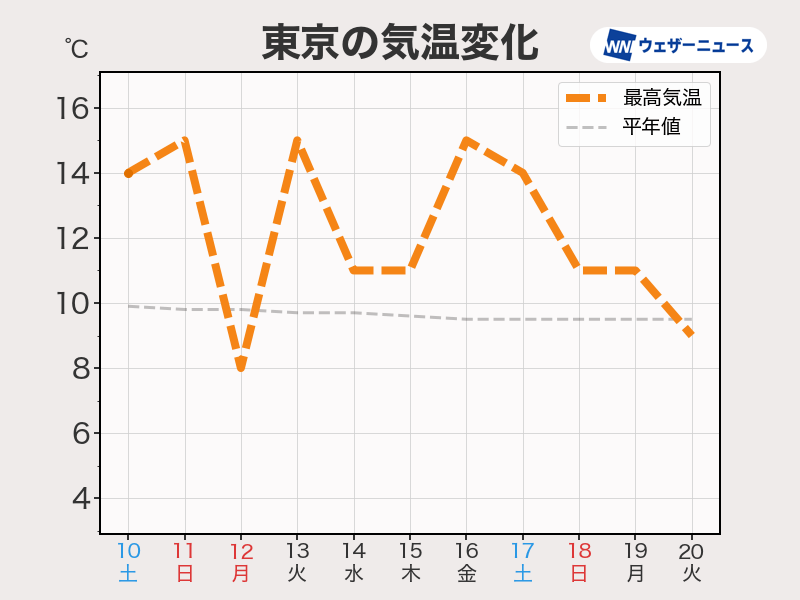 東京都心は13日(火)と16日(金)の最高気温が15℃の予想です。東海や西日本も多少の変動はあるものの、気温が上がってくる見込みです。