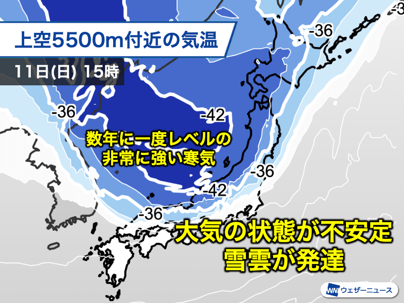 非常に強い寒気が南下することで大気の状態が不安定になり、日本海側では雪雲が発達しやすくなります。山沿いだけでなく、平地でも局地的に雪が強まり大雪となる見込みです。