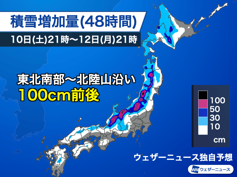 今夜から明後日12日(月・成人の日)夜にかけての48時間で予想される積雪増加量は、東北〜北陸の山沿いで多く、東北南部〜北陸では100cmに達する所もある見通しです。平地でも10〜30cmの新たな雪が積もる可能性があります。