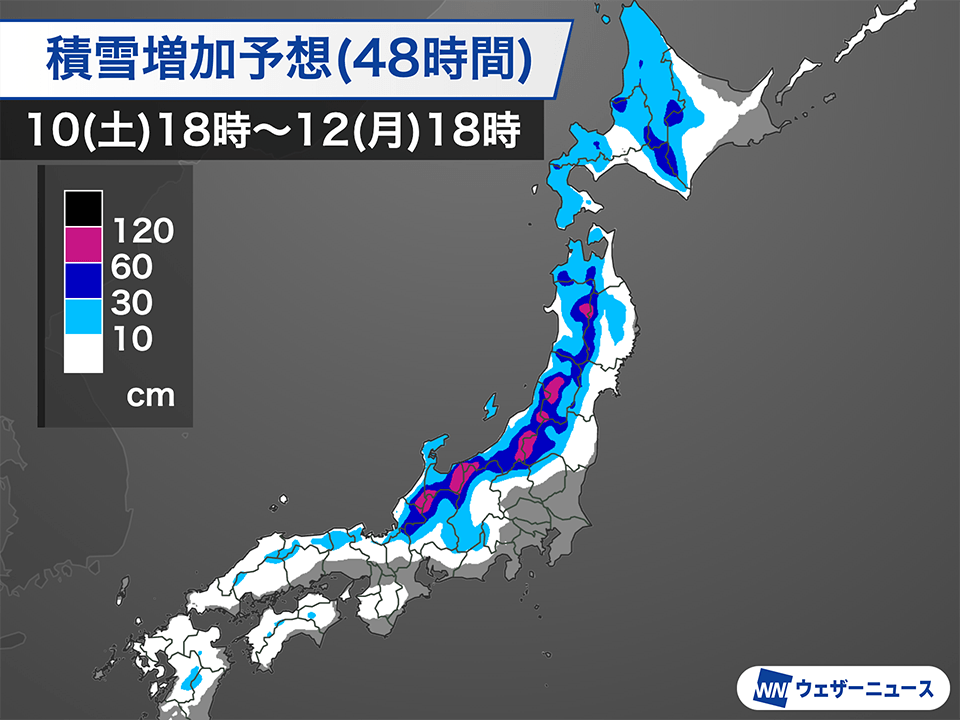 12日(月)は西日本から次第に寒気の影響はピークを越えますが、三連休明けの13日(火)には次の低気圧が北日本へ進み、14日(水)は再び冬型の気圧配置が強まります。このタイミングでも北日本や北陸では荒天となるおそれがあります。