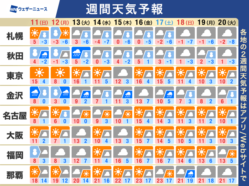 今日は寒さが少し緩んでいるところが多いものの、連休後半は12日(月)をピークに寒気の影響で厳しい寒さとなります。13日(火)は一旦緩むものの、14日(水)は北日本を中心に極寒となります。15日(木)以降は東日本や西日本を中心に、この時期としては気温が高めで推移しそうです。
