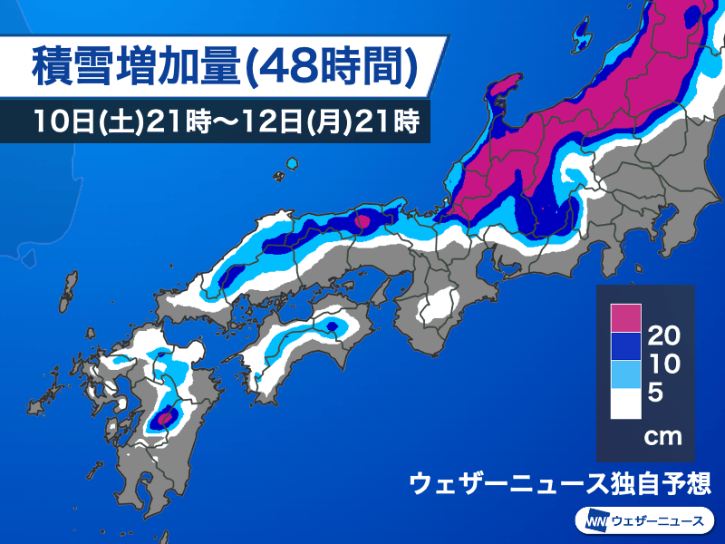 今夜から明後日12日(月・成人の日)夜にかけての48時間で予想される積雪増加量は、東北〜北陸の山沿いで多く、東北南部〜北陸では100cmに達する所もある見通しです。平地でも10〜30cmの新たな雪が積もる可能性があります。