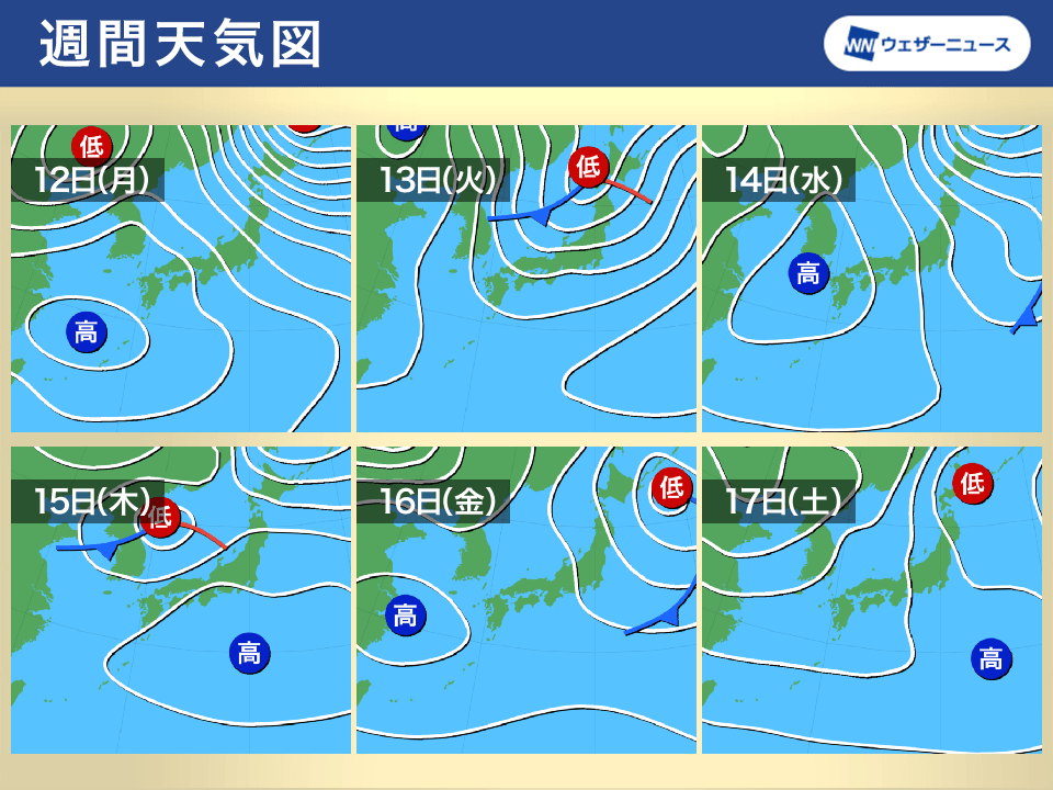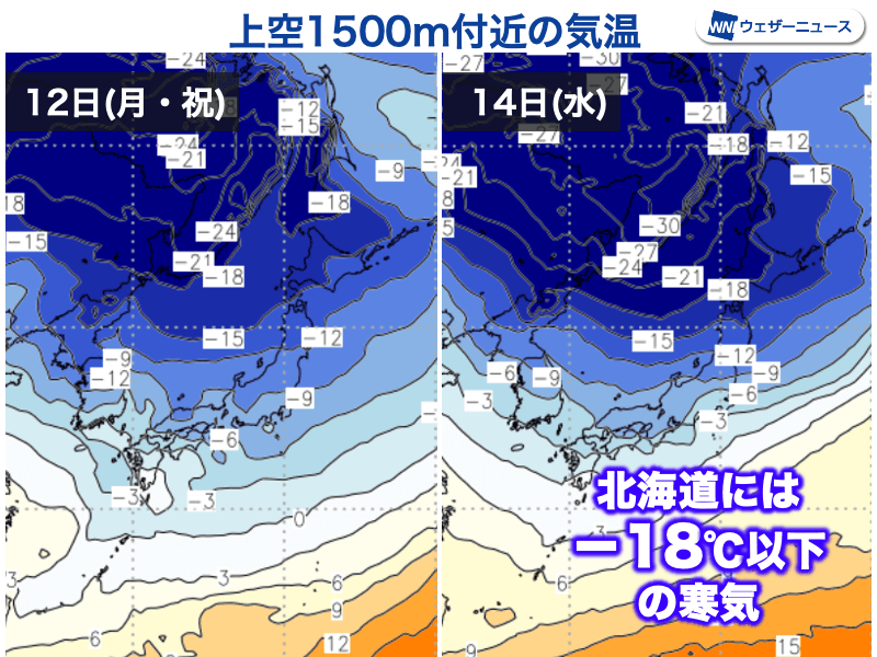 連休明けの13日(火)になると、再び低気圧が日本海を進んで寒気が北上、寒さが緩む見通しです。ただ、低気圧通過後は冬型の気圧配置となり、北日本を中心に強い寒気が流れ込みます。