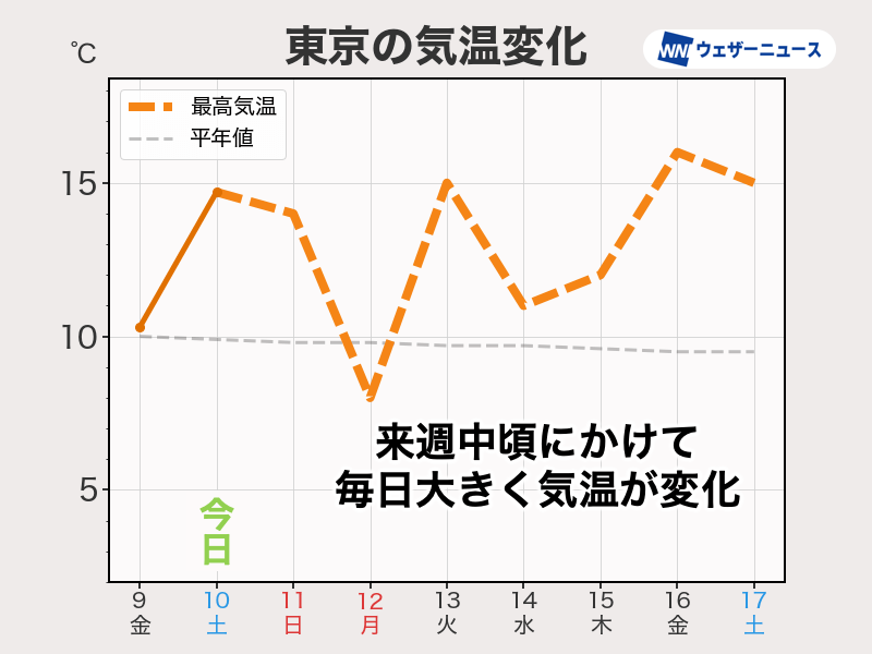 このように、日本付近は短い周期で気圧配置が変化するため、日毎の気温変化が大きくなる予想です。
