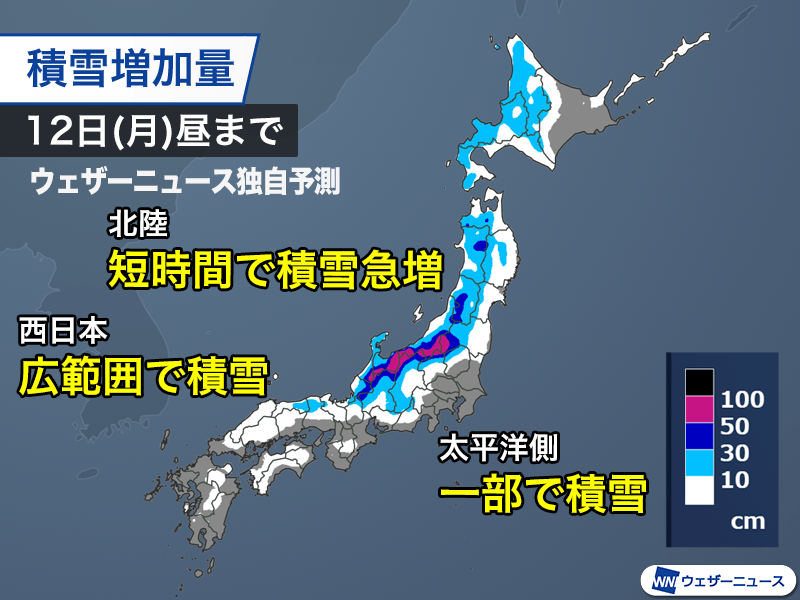 西日本でも内陸部を中心に最大で10cm程度の積雪が予想されます。寒気が強いため発達した雪雲の一部は太平洋側まで拡大し、仙台平野や濃尾平野などでも雪の積もる所がある見込みです。