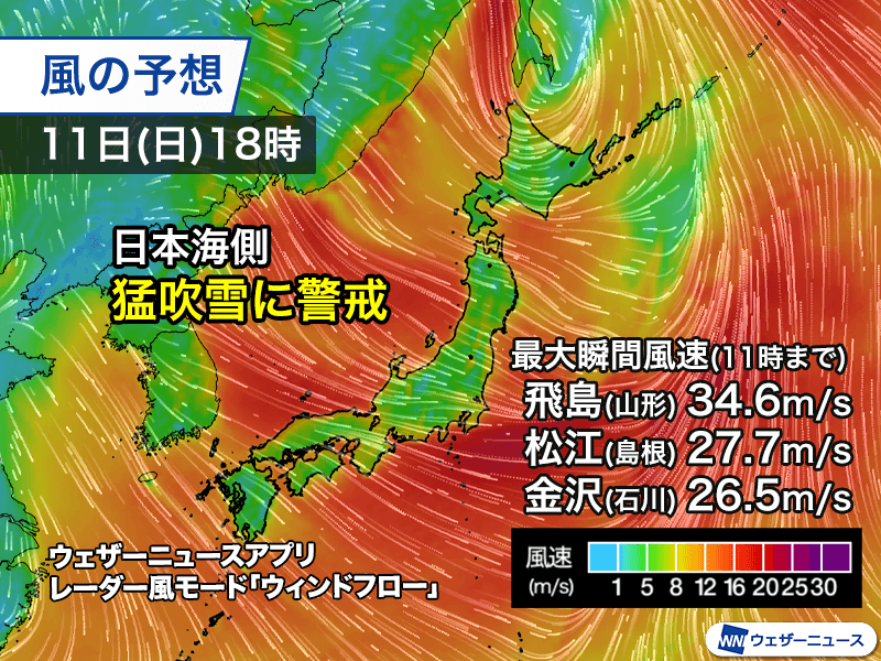 11時00分までの最大瞬間風速は山形県酒田市・飛島で34.6m/s、松江市で27.7m/s、金沢市で26.5m/sを観測。北海道、秋田県、山形県、新潟県、富山県、山口県、長崎県には暴風雪警報が発表中です。